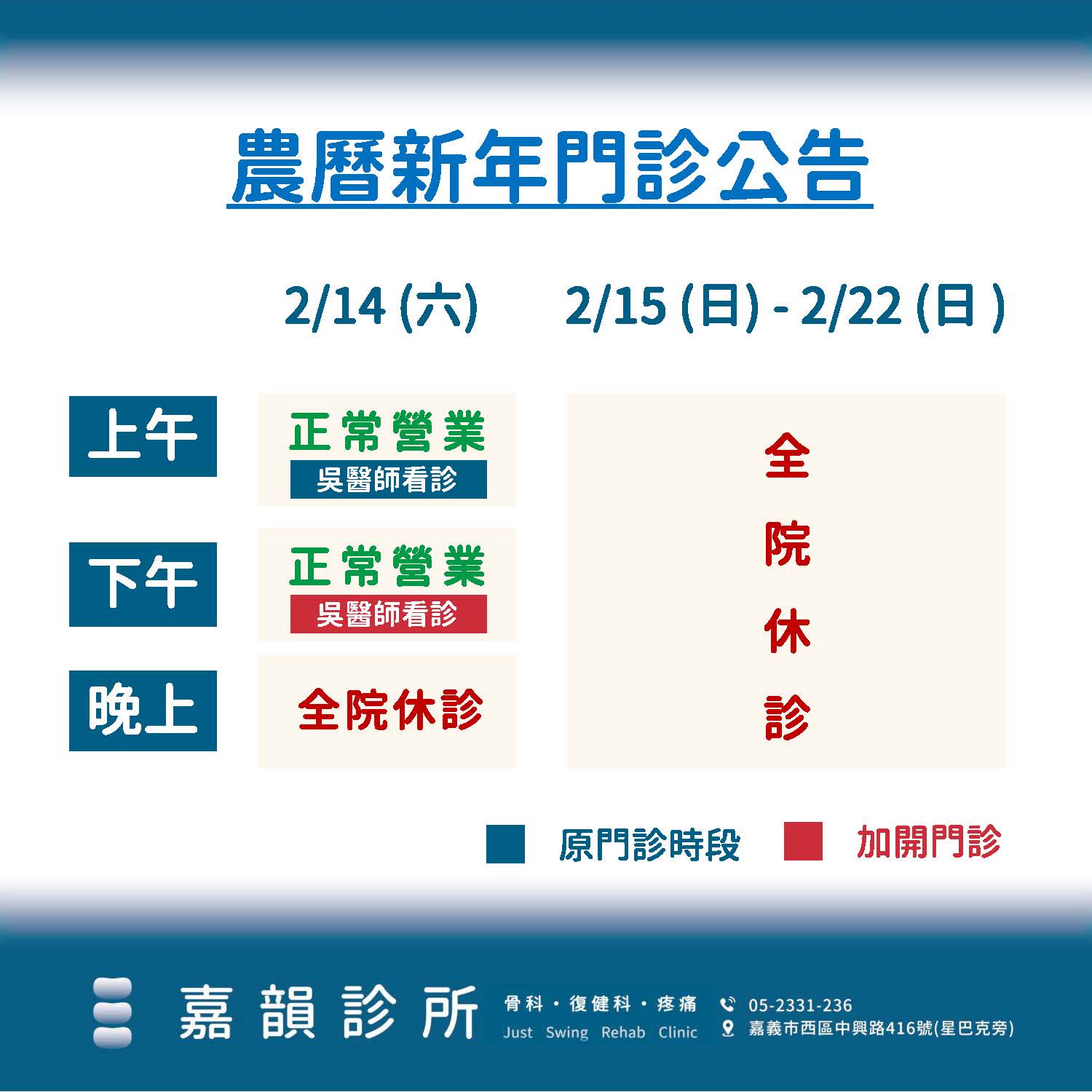 ✅ 2/14(六)農曆新年,正常營業,下午加開吳醫師門診。