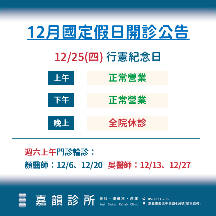 Toggle嘉韻12月門診異動與周六輪診公告