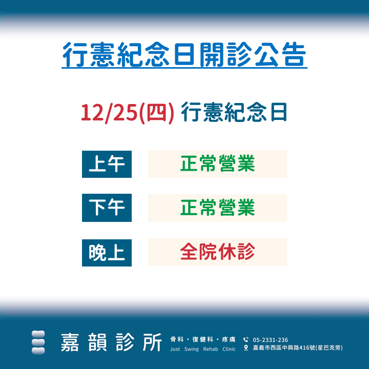 最新消息:114/12/25 行憲紀念日開診公告所有文章, 最新消息 / 作者: 嘉韻小編 / 2025-12-23 文章目錄 Toggle 嘉韻診所行憲紀念日公告行憲紀念日假日公告線上約診服務診所資訊 嘉韻診所行憲紀念日公告12/25(四)行憲紀念日 ✅ 上午、下午:正常服務 ❌ 晚上:全院休診 親愛的韻友您好:十二月的嘉義,空氣中多了節日的燈火與冬日的柔光在忙碌與期待交織的歲末也別忘了照顧辛苦一整年的身體嘉韻診所始終相信:節日的意義,不只是歡聚更是提醒我們,健康,是一年中最值得珍惜的禮物願這個聖誕與行憲紀念日成為您與家人安穩、心暖的一天行憲紀念日假日公告🔹12/25(四)行憲紀念日 ✅ 上午、下午:正常服務 ❌ 晚上:全院休診📍溫馨提醒:若有就診或復健需求可多加利用 12/25 上午與下午時段,或提前安排在其他日期。 線上約診服務📍 官方line:https://lin.ee/RDZlWOw📍 line ID:@justswing也可以點擊此連結線上約診 👉 https://pinmed.co/clinic/pdo375kl/booking診所資訊📍 嘉義市中興路416號(星巴克旁)📞 聯絡電話:05-233-1236 瀏覽數: 589