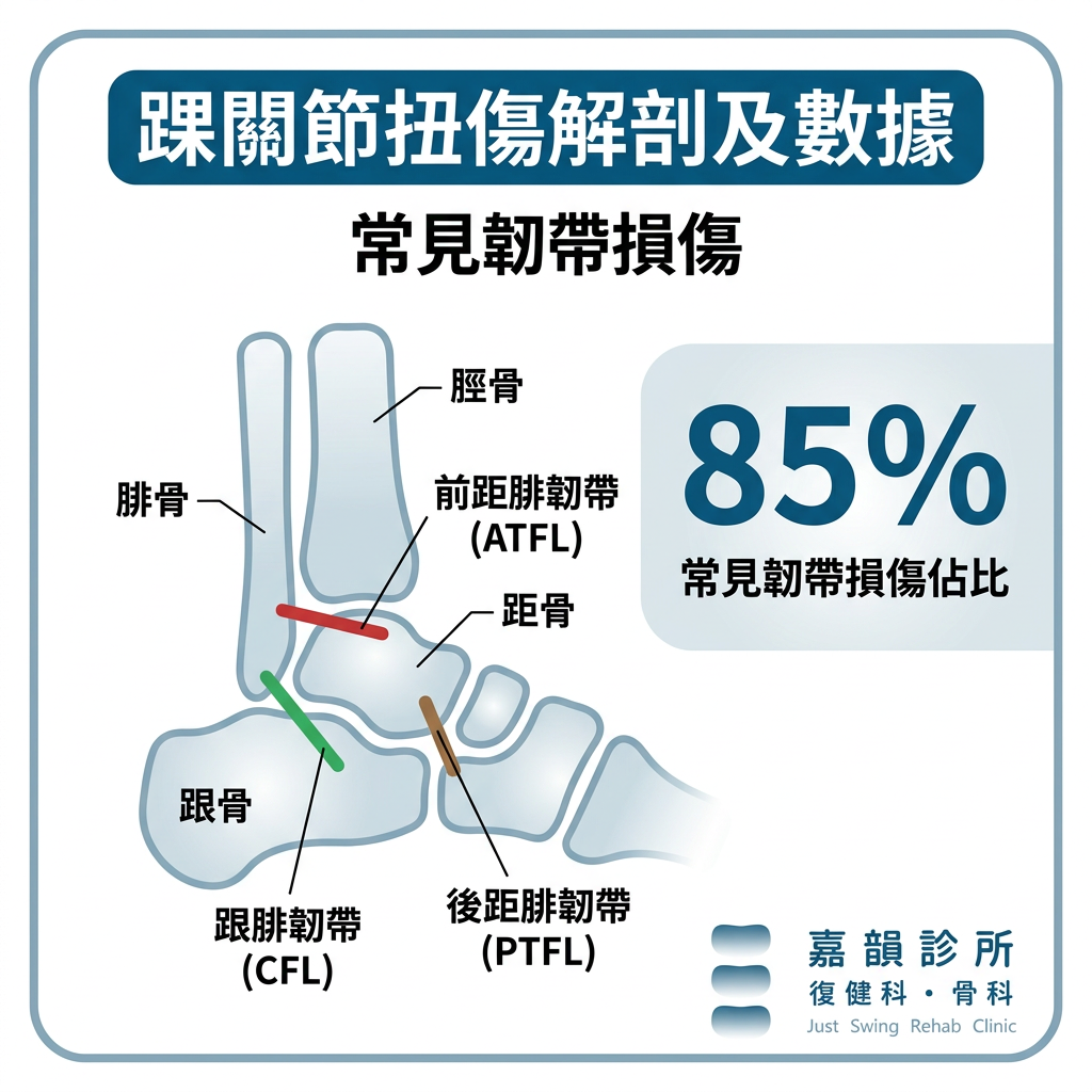 腳踝扭傷最常傷到的是外側韌帶群,約占所有踝關節韌帶損傷的 85%,其中前距腓韌帶(ATFL)因為結構最薄弱,73% 的案例都是它先斷 [2]。 了解你的韌帶到底傷到什麼程度,是決定治療方向的第一步。