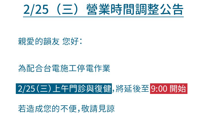 2/25(三)上午嘉韻診所門診與復健服務,將 延後至 9:00 開始營業。